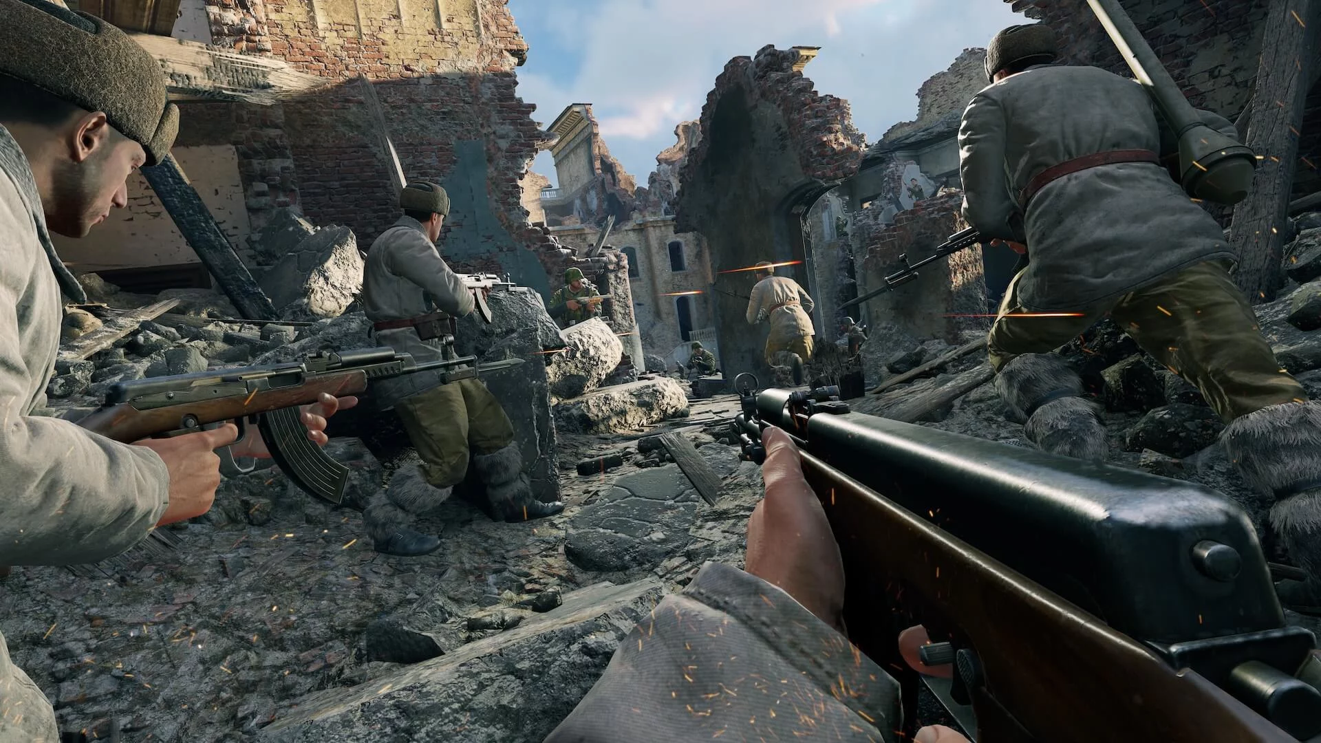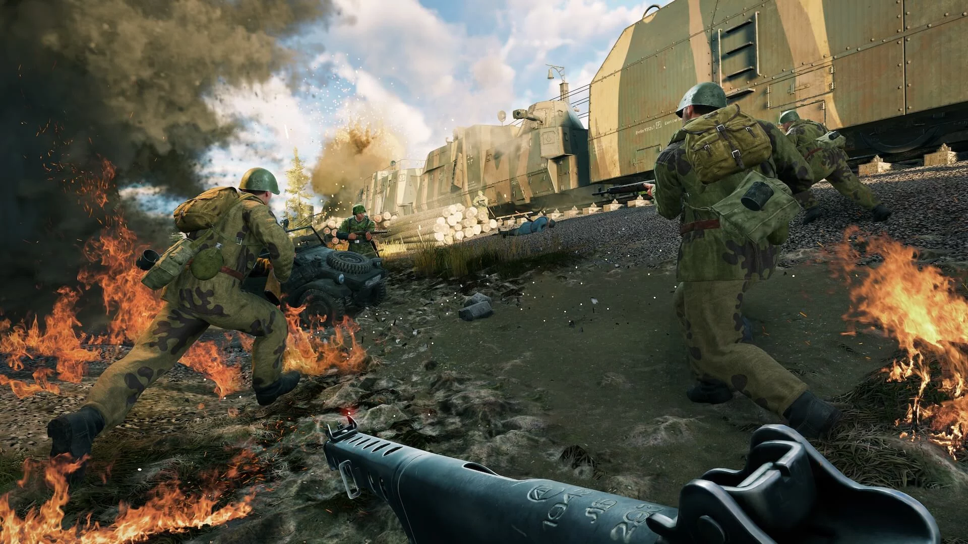 В сражениях Enlisted одновременно участвуют десятки отрядов с разной специализацией. Это обеспечивает максимальную плотность и зрелищность боя при сохранении высокого вклада каждого участника в победу команды. Пехота, бронетехника и авиация сражаются вместе, и за одну игровую сессию вы можете попробовать сразу несколько ролей.